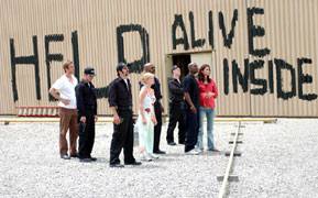 Кеннет: [пишет на доске, чтобы увидел Энди, стоящий на крыше дома напротив]